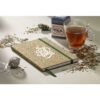 A5 formaadis märkmik. Tugev FSC-sertifikaadiga segumaterjalist kaas on valmistatud teelehe jääkidest, korgist, polüestrist ja puuvillast.